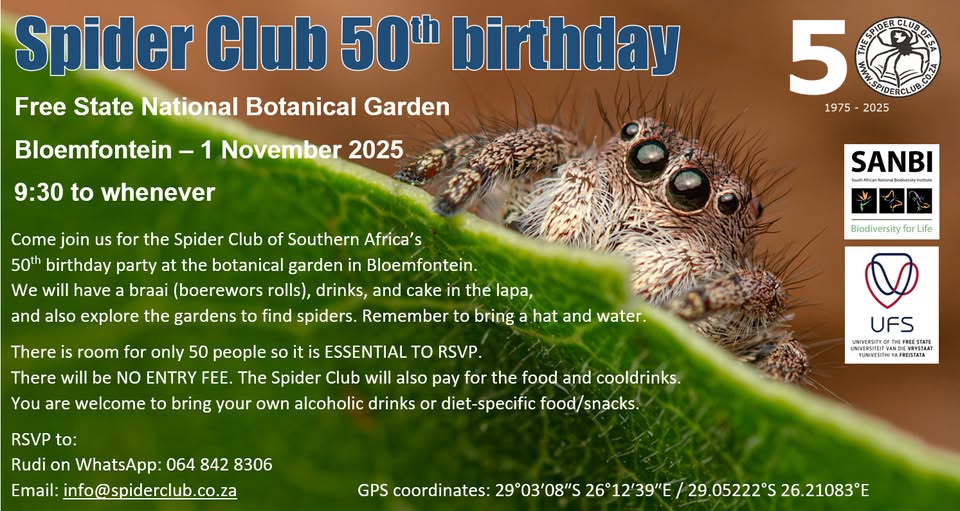 Come join us for the Spider Club of Southern Africa’s 50th birthday party at the botanical garden in Bloemfontein!