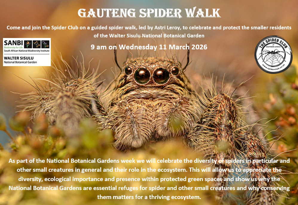 Keep your eyes on your e-mail and our Facebook page as other events may be organised, sometimes at short notice. We will attempt to give you fair warning. And remember that Norman Larsen is at the Cape Union Mart Adventure Centre, Canal walk in Cape Town every Saturday 11h00–12h00 to demonstrate and talk about SPIDERS!