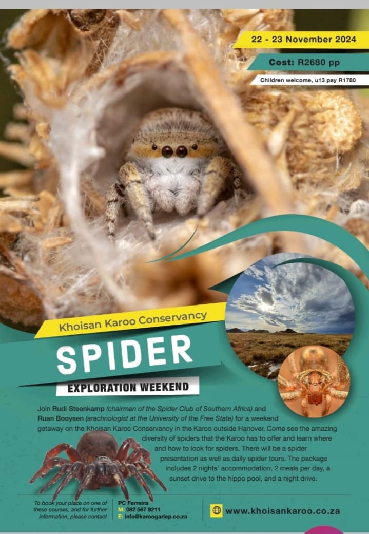 Join Rudi Steenkamp and Ruan Booysen for a weekend gateway on Khoisan Karoo Conservancy in the Karoo outside Hanover. Come see the amazing diversity of spiders that the Karoo has to offer and learn where and how to look for spiders. There will be a spider presentation as well as daily spider tours. The package ... Read more